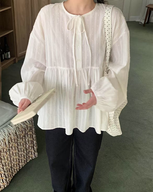 【Time Offer】蝴蝶結拼花圈線棉上衣