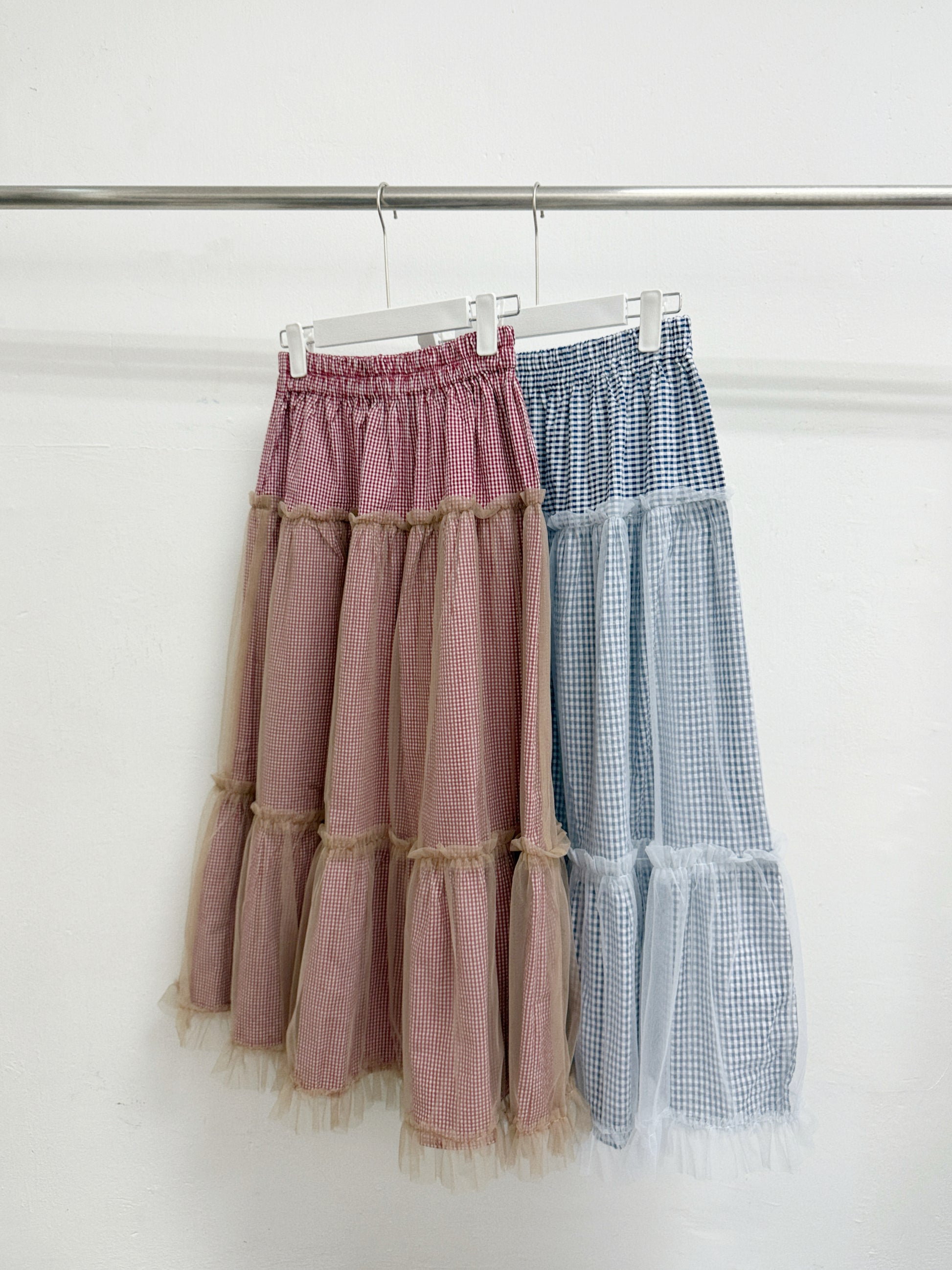 【SALE】泡泡棉格紋拼紗半身裙丨紅